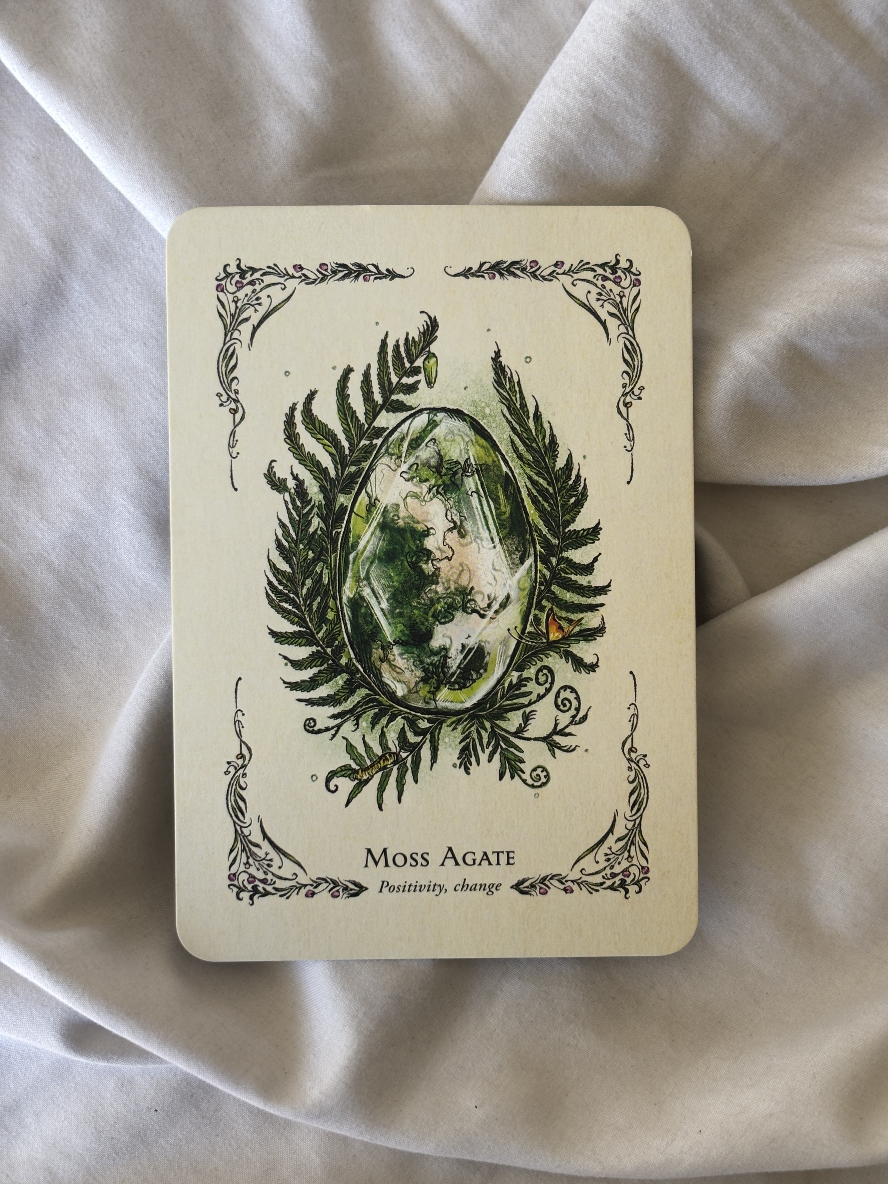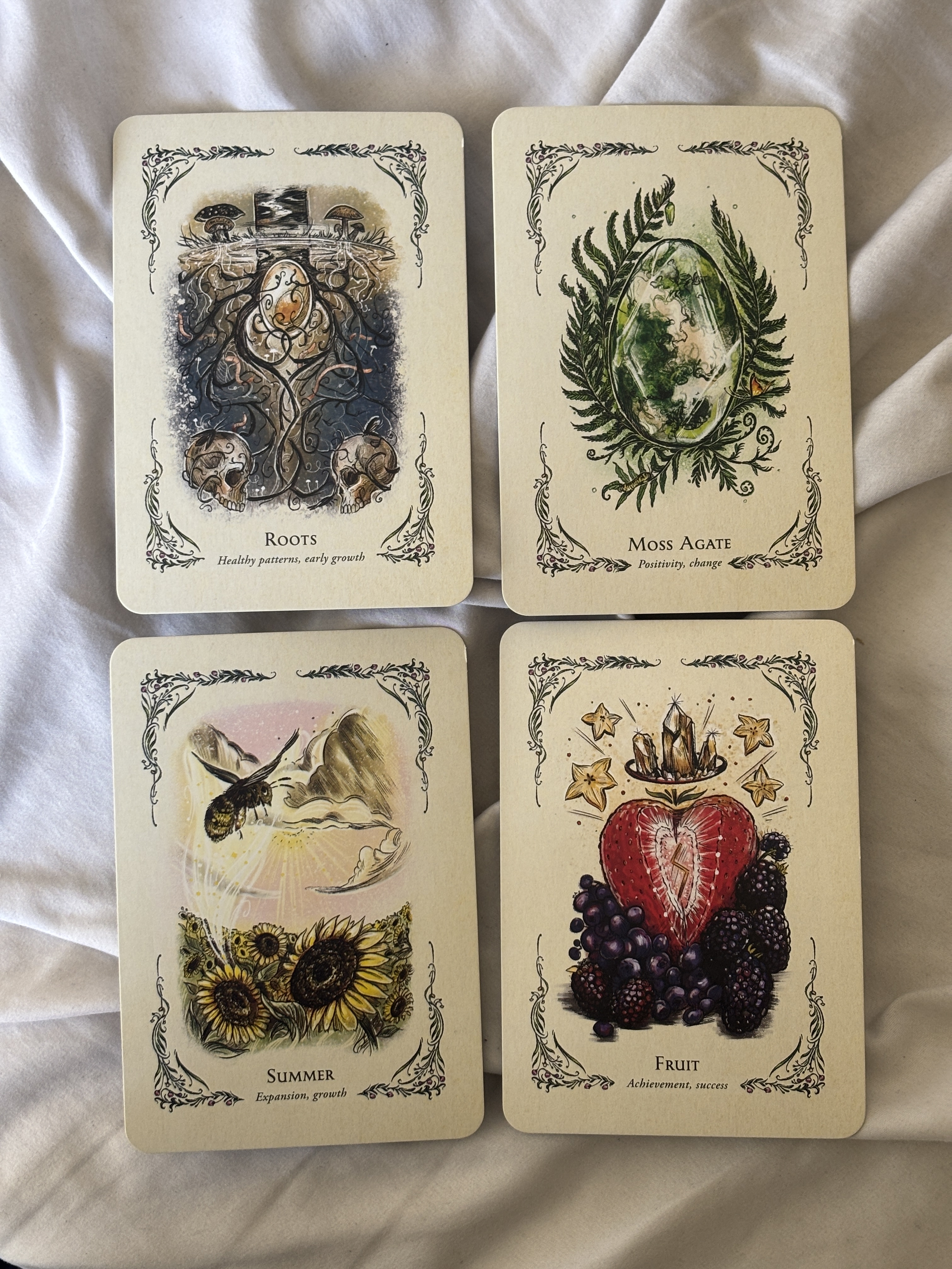 Wow what beautiful reading this is!! I hope it resonated with you all as much as it resonated with me! It is interesting how in my current phase of life, I am in a season of a lot of change. I am trying as much as I can to build a stable foundation for myself. The roots card explains my current moment of life very well. Even though I cannot see exactly where my vision is taking me, it’s more of this inner knowing that I am on a good path. I know that the steps I am taking are aligning well with my future. As someone who could be known as the “chaotic friend”, I honestly grew tired of that label. As a teen, I didn’t really care but now as an adult, chaos doesn’t feel very safe. It is very stressful and an energy I don’t want to live in. So, it does make me feel peaceful knowing that I am allowing myself the ability to build that stability. As for moss agate, I fear this card may have called me out. Mm… is there someone recording my thoughts? Weird. I often do feel this feeling. The thing is, I feel we often view stagnancy as just no movement. When stagnancy can be simple things we keep in our lives as well. You know, that “oh, I’ll just scroll for 30 minutes”, then it turns into 3 hours. Lol. Sometimes, we don’t notice the things that keep us stagnant because they aren’t large. As I’ve been on this small journey of just creating, I stopped letting the feeling of unpreparedness stop me because realistically, we do have the things we need to start. I can give an example, My blog… If you notice, you’ll see I don’t own my URL yet… emphasis on yet because I will. Sure, money is one reason, but another is because I just want to ensure I show up WITHOUT the investment pressure. I show up and write on this website because I want to and I don’t have to worry about any pressures. I also wanted to be an example that you can start a blog at any time without the money restrictions in the beginning. You must try the thing, the longer you keep the mindset of “I’m not ready” or “I’ll start when I get (random item)” the longer you’ll continue to procrastinate. Trust yourself. As for fruit and summer, well, I believe these might be future cards!! I can’t see into the future, but I can trust in myself and that makes me happy!!