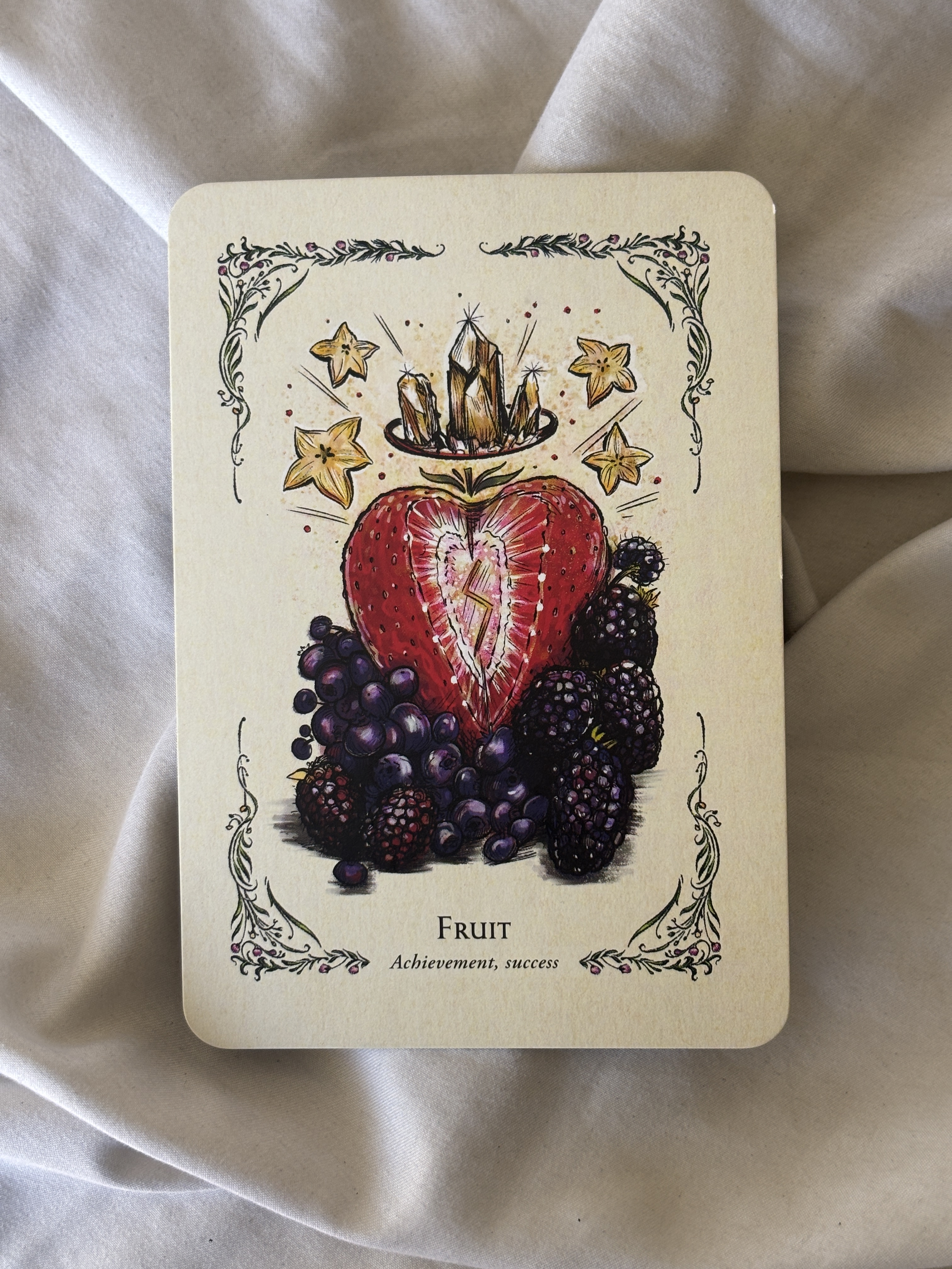 Fruit: Proof of an achievement. Hard work has yielded satisfying results or is about to! Be joyful! Things take time, energy, and attention. Even if work is invisible to others or behind the scenes, the fruit of that labor, however, is proof that energy was invested. Catch your breath and celebrate! (pg. 107)